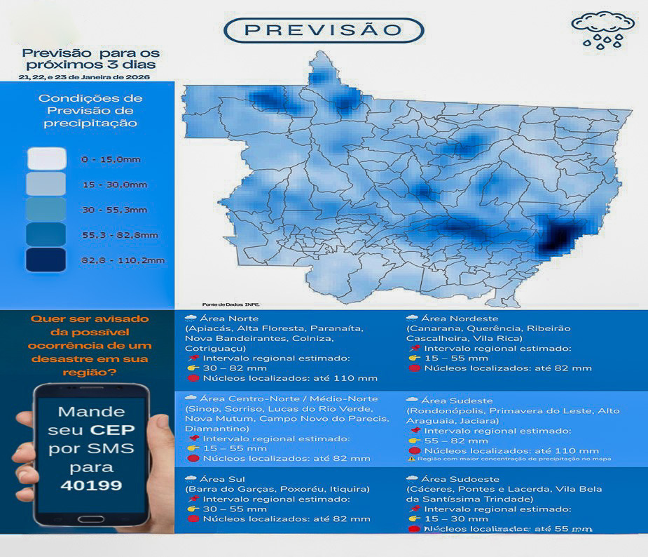 Diante da intensificação do período chuvoso, a Secretaria Municipal de Defesa Civil de Cuiabá reforçou as ações preventivas e as orientações à população, com base no panorama meteorológico atualizado para os dias 21 a 23 de janeiro de 2026. As informações são fundamentadas em dados oficiais do Instituto Nacional de Pesquisas Espaciais (INPE) e […]