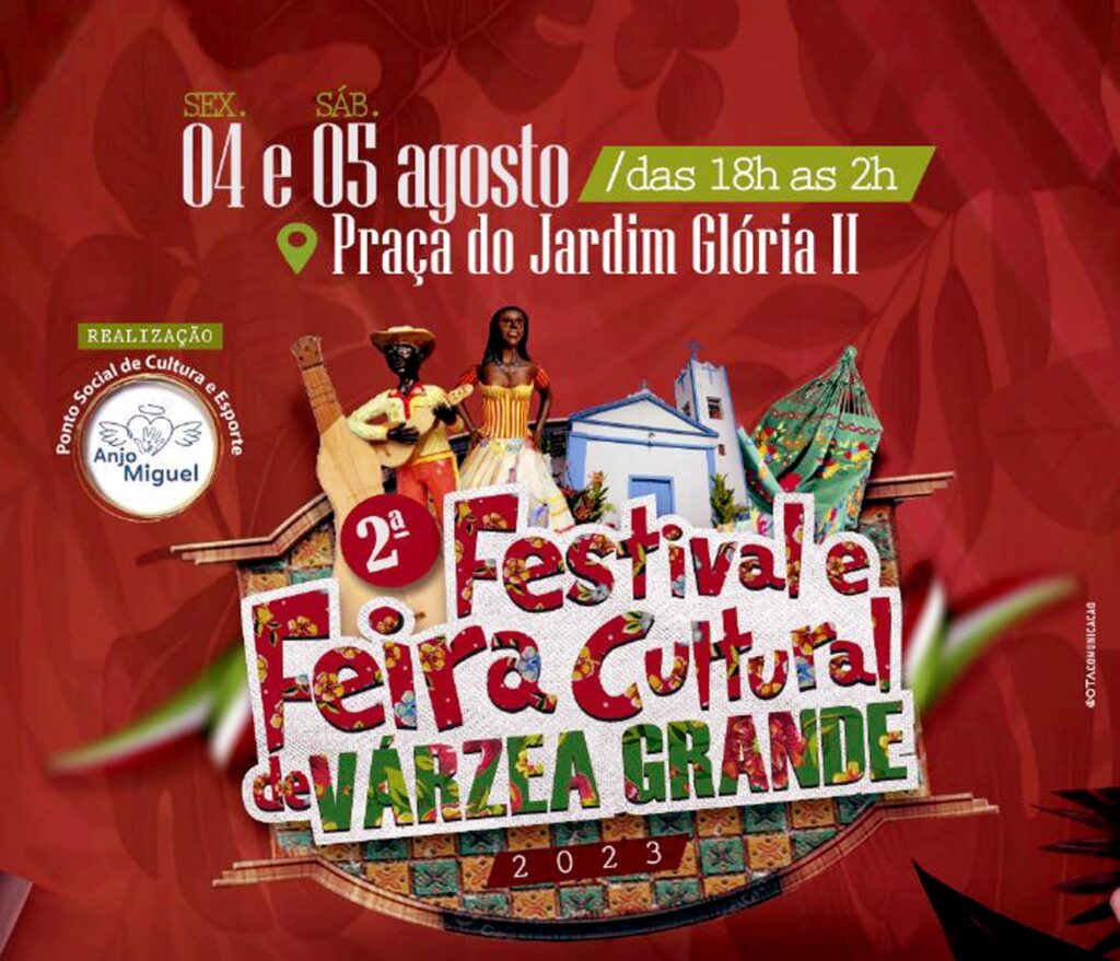 A praça do Jardim Glória II, em Várzea Grande, será o endereço do 2º Festival e Feira Cultural de Várzea Grande. A edição 2023 será realizada neste final de semana, dias 4 e 5, com entrada franca. Na programação estão shows culturais e regionais, apresentações de dança e teatro e praça de alimentação. O evento é uma realização do Ponto Social de Cultura e Esporte ‘Anjo Miguel’ e conta com total apoio da prefeitura municipal.