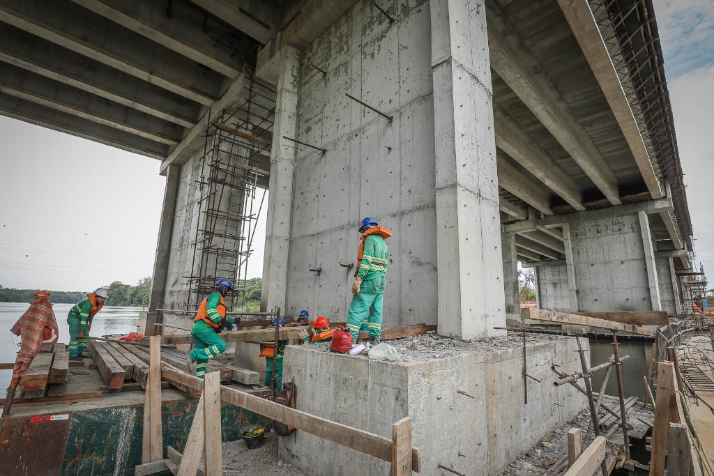 As duas novas pontes sobre o Rio Cuiabá, uma para ida e outra para volta, estão com 98% da estrutura pronta. No momento, o Consórcio responsável pela obra está executando a concretagem da laje. Isso significa que estão concretando o local por onde os carros vão passar.