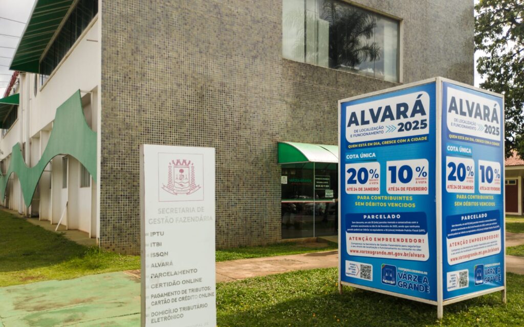 O Alvará de Localização e Funcionamento do exercício 2025, em Várzea Grande, pode ser pago à vista até o dia (24) com desconto de 10%. Somente têm direito os contribuintes que não possuírem débitos anteriores, ou seja, estão adimplentes junto ao Fisco Municipal.