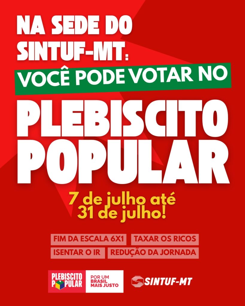 Movimentos sociais lançaram nesta semana, em todo o país, um plebiscito popular para ouvir a população sobre duas pautas: o fim da jornada de trabalho no modelo 6×1 (seis dias de trabalho e um de folga) e a isenção do Imposto de Renda para pessoas com renda mensal de até R$ 5 mil. Em Cuiabá, a sede do Sindicato dos Trabalhadores Técnico-Administrativos em Educação da UFMT (Sintuf-MT) é um dos pontos de votação presencial, com funcionamento de segunda a sexta-feira, das 8h às 17h, até o dia 31 de julho.